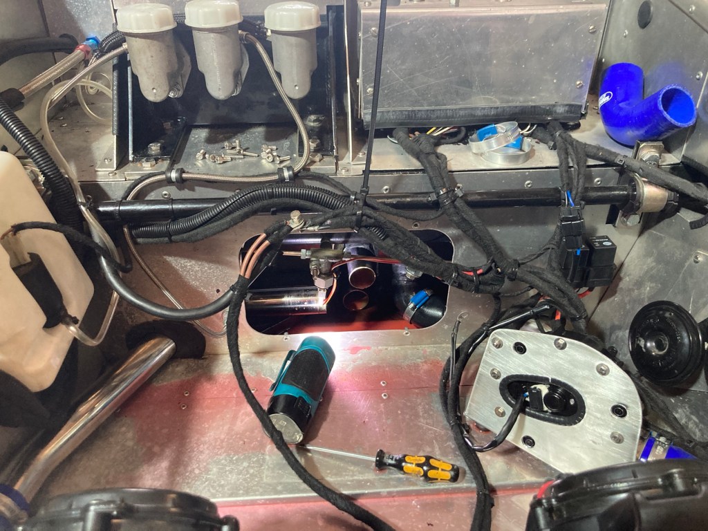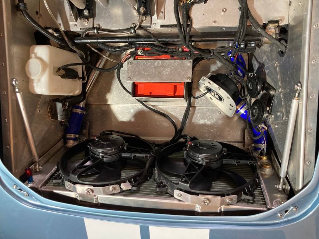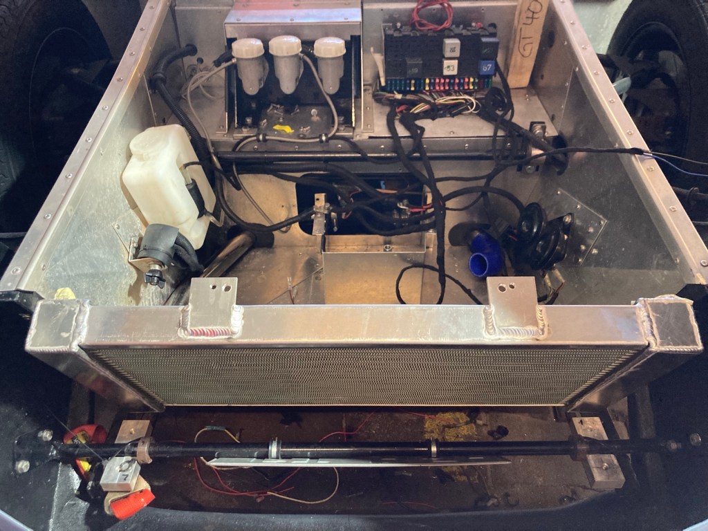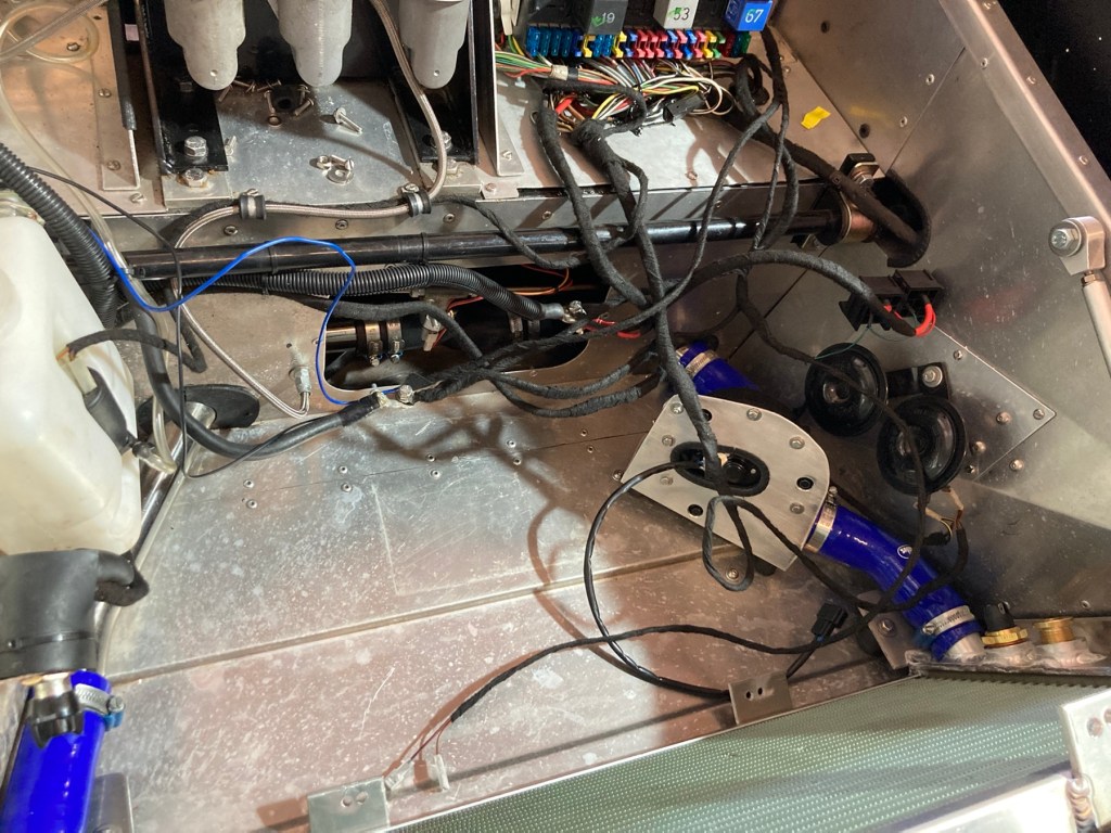 Und dann war da noch die Inbetriebnahme der schon montierten elektrischen Wasserpumpe. B hatte zunächst mit allerhand pneumatischer Werkstattausstattung einen Unterdruck im Kühlsystem erzeugt, um eine möglichst vollständige Wasserbefüllung sicherzustellen. Das hat auch alles gut geklappt, jedoch zeigte sich bei laufendem Motor, dass das Wasser im Motor schon fast kochte, während es am Kühler eher kühl zuging. Des Rätsels Lösung bestand im Kenntnisgewinn dergestalt, dass ich die Zusatzpumpe im falschen Wasserstrang eingebaut hatte, sodass Motor- und Zusatzpumpe im fairen Wettbewerb gegeneinander arbeiteten, was der gewollten Kühlleistung leider sehr, sehr abträglich war. Also habe ich den halben Vorderwagen (🤥) demontiert, und den Wasserkreislauf anders gestaltet. Hier ein Bild der Bauarbeit …