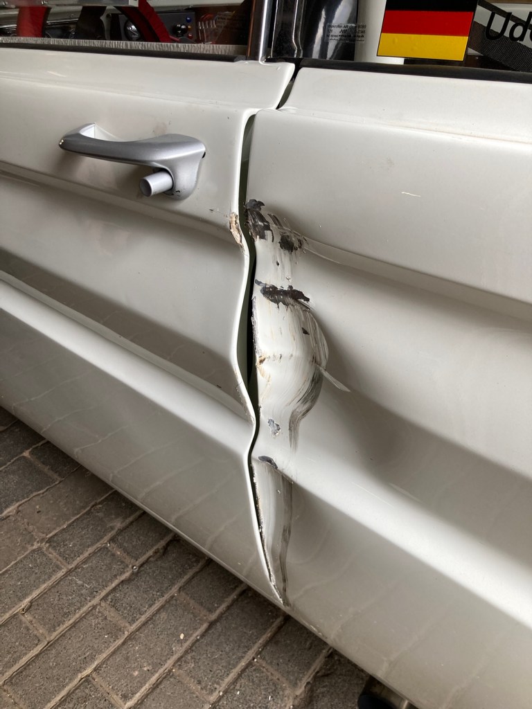… und 4. kam R gleich, um die notwendigen Karosseriearbeiten zu besichtigen und zu planen, und 5. ist die Sch…bühne bereits durch F, B und H abgebaut. Hier der Einschlag der hinteren linken Aufnahme im Seitenteil: