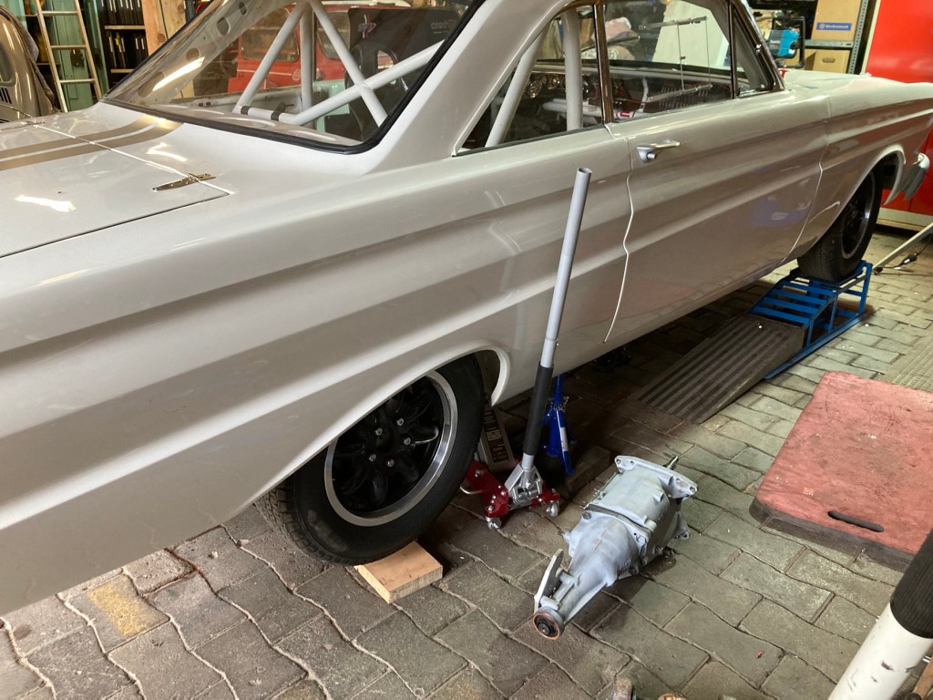 Nicht überraschend, stand der wiederholte Wiedereinbau des Borgwarner T10 Getriebes in den Falcon auf dem Plan. Irgendwie ist es gelungen, unter Mithilfe Dritter (B) diese anspruchsvolle Aufgabe abzuschliessen, und auch gleich noch Getriebeölbefüllung, Getriebequerträgermontage, Abgasanlageneinbau, Schaltkulissenverschrauben und Befestigen der Kardanwelle innerhalb nur weniger Stunden, entspannt auf dem Boden liegend, zu realisieren. Theoretisch fährt der Falcon wieder, und das ohne Flüssigkeitsverlust.