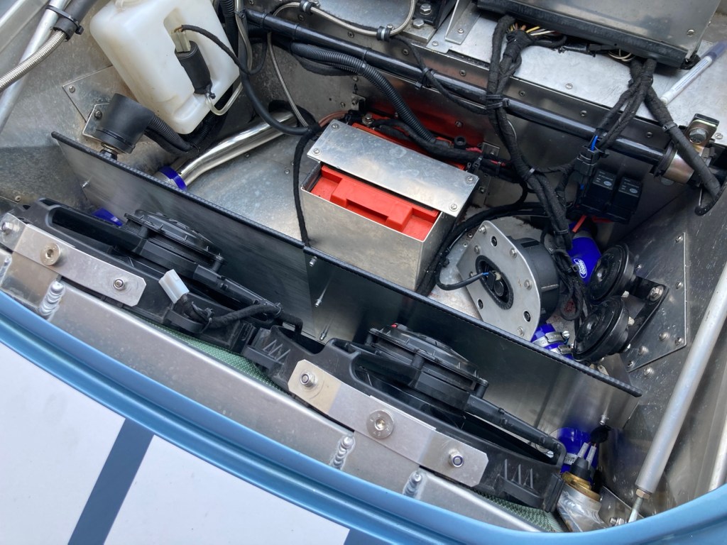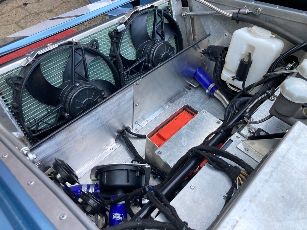 Danach konnte ich mich dem GT40 widmen, der mich/uns in der kommenden Woche nach Le Mans fahren soll. Der Einsatz im front clip (nostril) endet auf der Hälfte des Lüfterdurchmessers, also sozusagen in dessen Mittelpunkt. Dies hat zur Folge, dass etwa fünfzig Prozent der erwärmten Luft, die die Lüfter ansaugen, an die Umgebung abgegeben werden, und dass die restlichen fünfzig Prozent unterhalb des front clips landen, und dann als Temperaturerhöhung ihren Weg in das Cockpit finden, was wiederum die Temperatur dort erhöht, was im Winter angenehm ist, im Sommer jedoch eher als lästig empfunden wird.