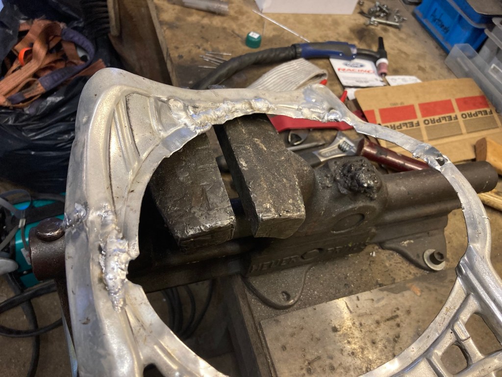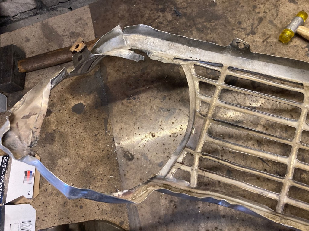 Da ja die Arbeit nicht ausgeht, stand die Behebung der direkten Kollisionsschäden an. An den Aluminiumteilen habe ich noch ein wenig herumgerichtet, und dann den Vorderwagen provisorisch zusammengebaut: