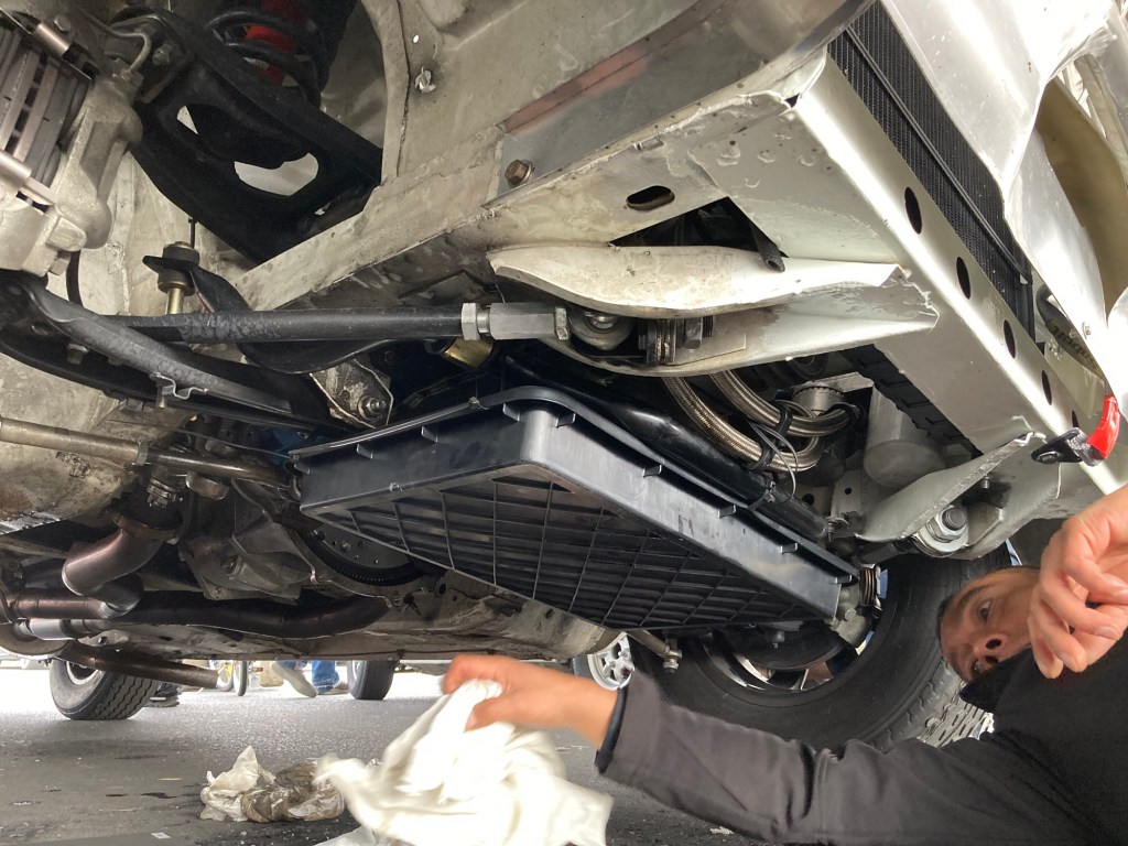 Zurück in der Box beziehungsweise im Zelt wurde klar, dass der Transport zurück nach Ostwestfalenlippe nur mit Auslaufschutz unter der eigentlichen Ölwanne Sinn ergeben würde. Also haben H und B aus meiner Blumenabtropfschale eine zweite Ölwanne gebaut, um trotz vorgenommener Abdichtmassnahmen eventuell auftretende Leckagen auffangen zu können: