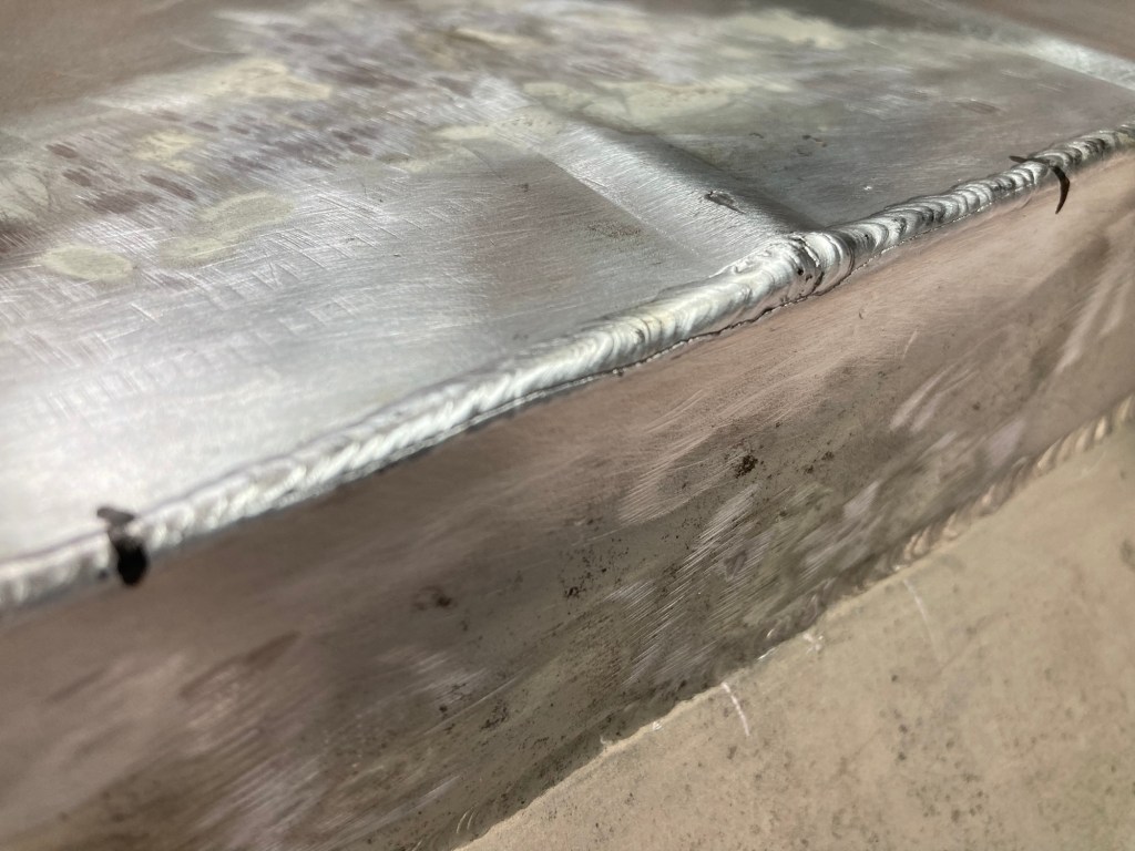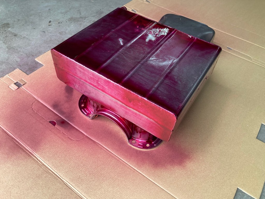 Die ausgebaute Ölwanne (zur Demontage musste das halbe Lenkgestänge gleich mit gelöst werden) habe ich dann zum WIG-Schweißen zu M gefahren, und wir haben sicherheitshalber alle Nähte einer PT-Prüfung, umgangssprachlich auch rot-weiß-Prüfung genannt, unterzogen. Ergebnis: zum Glück negativ: